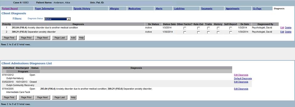 There is a new tab in the client record labeled “Diagnosis” and it shows the diagnosis list for a client as well as a summary view of the diagnosis from all admissions, past and current. From the Client Diagnosis listing you can add, edit, and delete diagnosis entries for this client. From the Admission Diagnosis List, you can use the “Edit Diagnosis” link to open the admission diagnosis screen. If no diagnosis has been entered yet, you can use the “Default Diagnosis” link to default the admission diagnosis from the diagnosis information that has been entered for the patient. Keeping the Patient Diagnosis up to date coupled with the default diagnosis feature can streamline coding new admissions.
