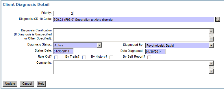 Once you select a Client Diagnosis row, the screen changes and you can make changes to the client diagnosis that you chose. Keep in mind that making changes here will change the Client Diagnosis. To prevent coding errors, the ICD-10 Diagnosis Code is read only. Click the “Update” button to save your changes.