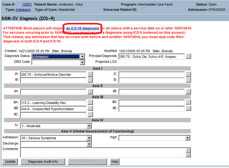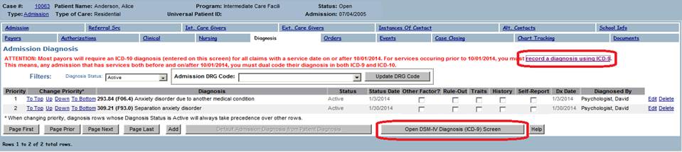 The ICD-9 / DSM-IV diagnosis tab will be replaced by a new ICD-10 Admission Diagnosis screen. The old screen can be accessed from a link at the top of the ICD-10 Admission Diagnosis screen, as well as by clicking a button near the bottom of the screen. From now until 10/1/15, when you click the “Diagnosis” tab on the admission record, you will be taken to the old ICD-9 / DSM-IV Diagnosis Screen. We hope leaving the ICD-9 screen as the default screen for this tab will be helpful to staff. Once on the old ICD-9 screen, there is a link at the top of the page to open the new ICD-10 Admission Diagnosis screen. Beginning 10/1/15, the new ICD-10 Admission Diagnosis screen will become the default screen for the diagnosis tab.