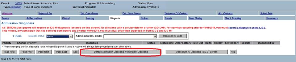 In addition to being able to default an Admission Diagnosis from the Admission List on the Client Diagnosis Screen, there is a button to do this on the Admission Diagnosis screen. This button is only available when there are no Admission Diagnosis rows.