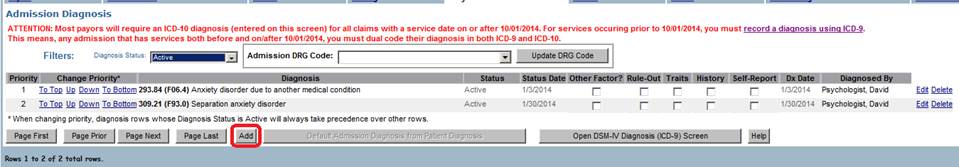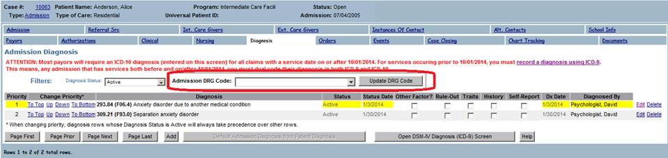 You can also change the priority order by using the “To Top”, “Up”, “Down”, and “To Bottom” links on the Admission Diagnosis list.