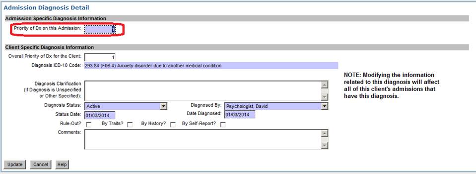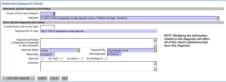 The screen will change and you will have access to all the fields to enter a new diagnosis. When you add a diagnosis in this manner, it will save a row to the Client Diagnosis as well as a row to the Admission Diagnosis. Click the “Update” button to save your changes.