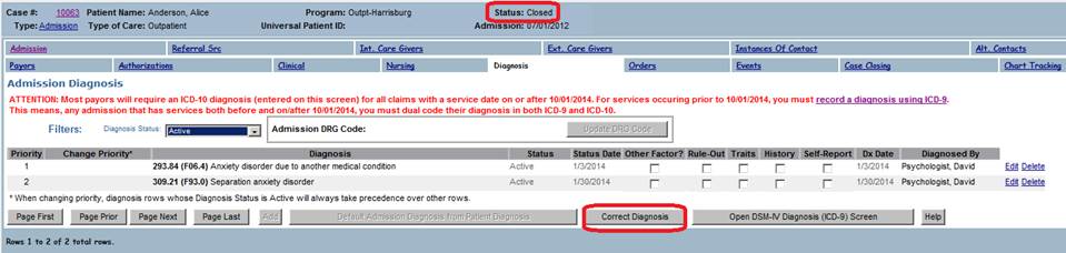 When you close an admission in Epitomax©, the Admission Diagnosis will become read only. This helps preserve the diagnosis so that future changes to the client diagnosis do not change the diagnosis on the closed admission. If necessary, you can make corrections using the “Correct Diagnosis” button on the Admission Diagnosis screen. If you reopen the admission, the Admission Diagnosis rows will be synchronized with the corresponding client diagnosis rows, and any corrections to the admission diagnosis will be lost.
