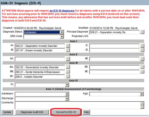 From the old ICD-9 / DSM-IV Diagnosis screen, click the “Convert to ICD-10” button.