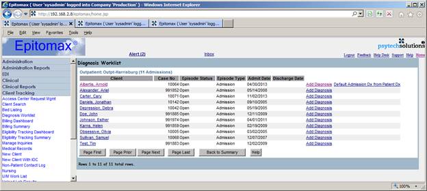 We created a Diagnosis Work List screen primarily to help you track coding your clients into ICD-10. From the summary view, you can see an overview of your organization and how many admissions still need ICD-10 coding. We have also provided a detail view with links to assist you in coding your clients.