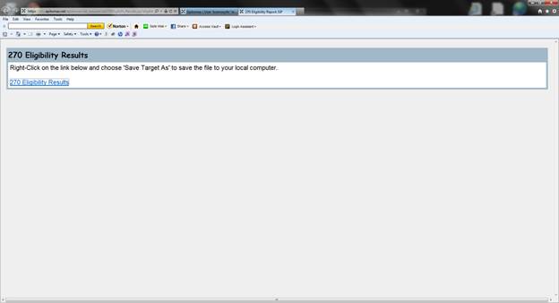 Right-click on the 270 Eligibility Results link and choose ‘Save Target As’ – Save the file on your computer or network.